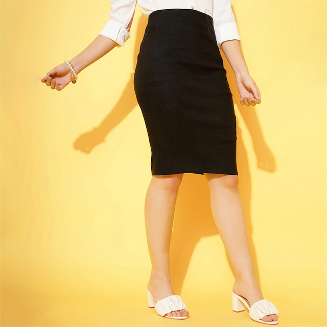 Black solid formal knee long stretchable pencil skirt, has a side slit ,zip closure and elasticated waist band