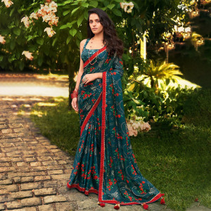 Teal & Red Floral Pure Chiffon Saree